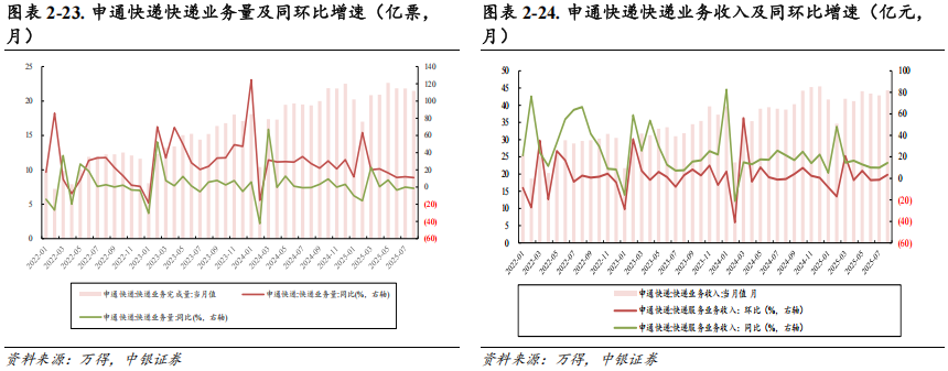 申通快递:2025年8月单票价格2.06元,同比+3.00%(+0.06元),环比+4.57%(+0.09元)。