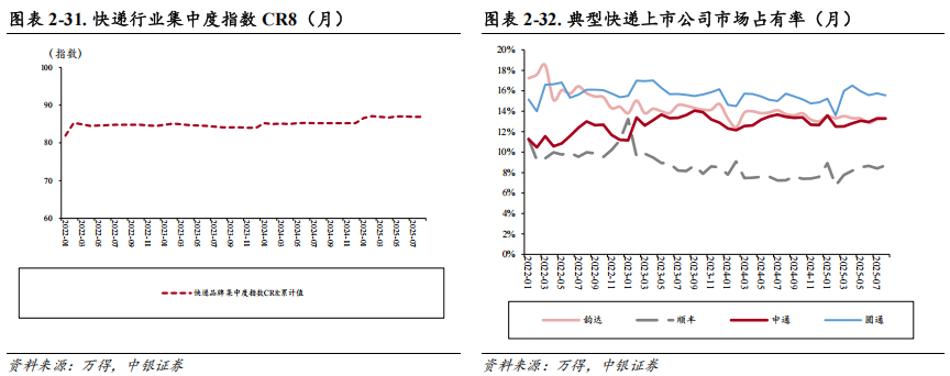 2025年8月快递业品牌集中度指数CR8为86.90。2025年8月,快递与包裹服务品牌集中度指数CR8为86.90,同比增长2.00%,环比与7月持平。