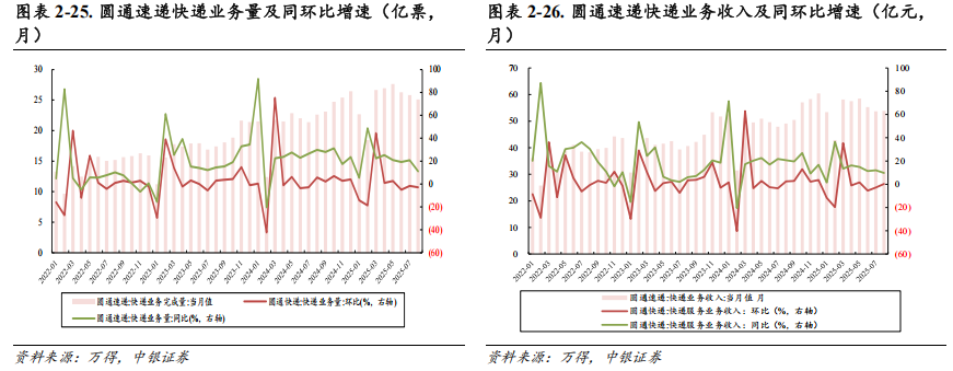 圆通速递:2025年8月快递业务量25.11亿票,同比上升11.06%,环比下降2.79%,业务收入53.90亿元,同比上升9.82%,环比上升0.35%。