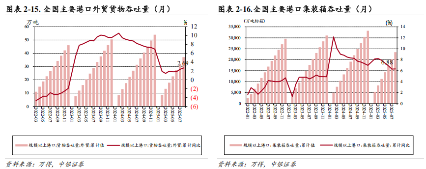 2.2.2量:2025年1-8月全国港口货物、集装箱吞吐量分别为120.26亿吨/23443万标箱