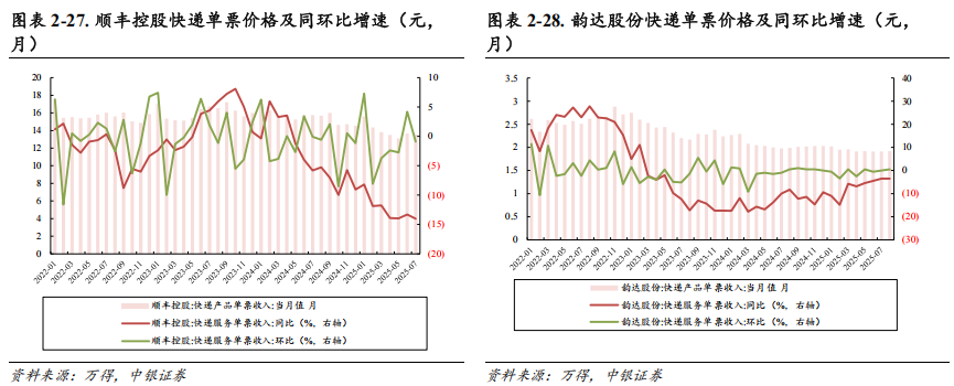 顺丰控股:2025年8月单票价格13.27元,同比-15.32%(-2.40元),环比-2.07%(-0.28元)。