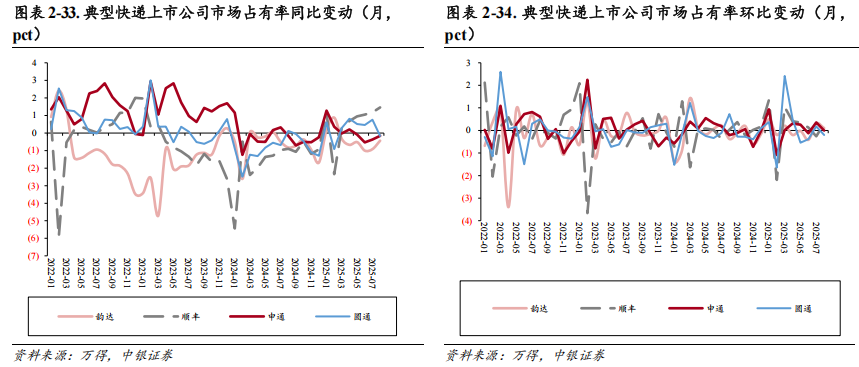 韵达股份:8月韵达的市占率为13.28%,同比-0.44pct,环比+0.10pct。