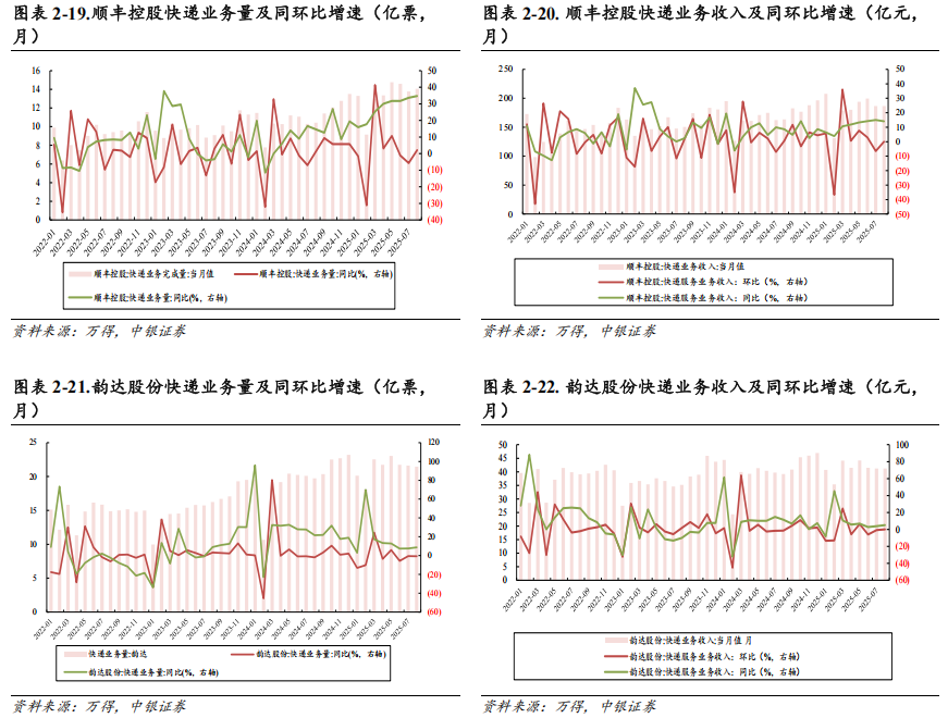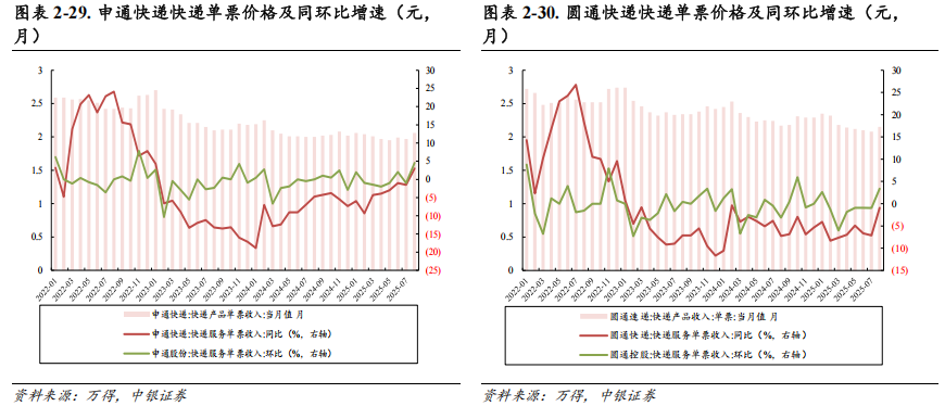 圆通速递:2025年8月单票价格2.15元,同比-0.92%(-0.02元),环比+3.37%(+0.07元)。