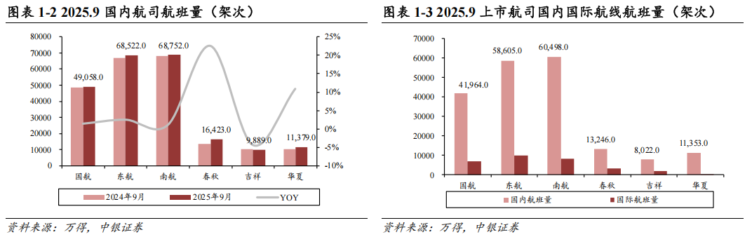 2.1.2 量:2025年9月货运执飞航班量国内航线同比上升,国际航线同比上升