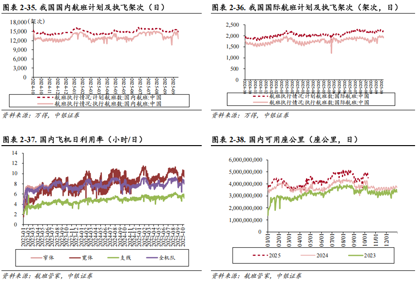 国内飞机日利用率环比上升。2025年10月4日﹣2025年10月10日,中国国内飞机利用率平均为8.46小时/天,较上周日均下降0.10小时/天;窄体机利用率平均为8.46小时/天,较上周日均下降0.10小时/天;宽体机利用率平均为10.01小时/天,较上周日均值下降0.09小时/天。