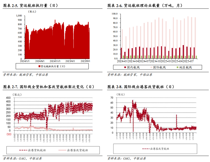 2025年9月货运国内执飞航班量同比上升,国际航线同比上升。根据航班管家数据,2025年9月,国内执飞货运航班7604架次,同比+3.05%;国际/港澳台地区执飞货运航班13250架次,同比+15.86%。