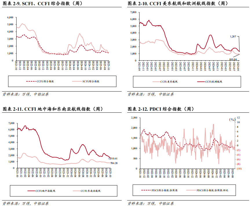 集运:SCFI指数报收1160.42点,运价上升。2025年10月10日,上海出口集装箱运价指数(SCFI)报收1160.42点,周环比+4.12%,同比-43.74%;2025年10月10日,中国出口集装箱运价指数(CCFI)报收1014.78点,周环比-6.68%,同比-31.29%,分航线看,美东航线、欧洲航线、地中海航线、东南亚航线周环比-7.06%/-8.19%/-8.41%/-2.20%,同比-27.57%/-40.29%/-37.40%/-17.34%。