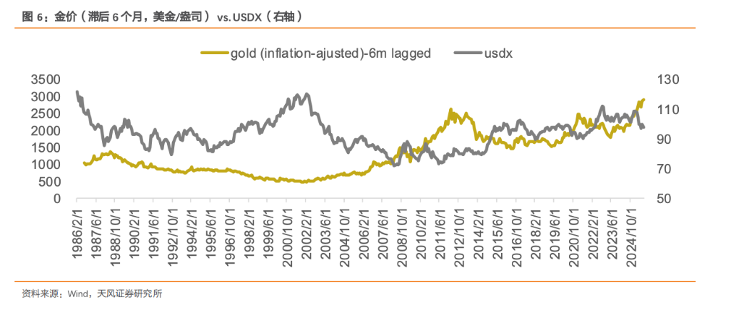 回归显示,金价和美元指数历史长期一直呈现负相关。按照1986-2000,2000-2020,2021-2025分段回归,都显示负相关。