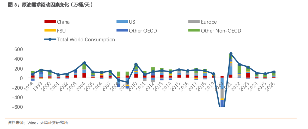 2021 年之后中国需求增速下台阶,美国主导的需求属性再度回归(2020-2025 年全球原油 需求累计增加 1211 万桶/天,中国拉动 212 万桶/天,占比仅 18%,美国和欧洲占比 28%, 其他非 OECD 国家占比 47%)。