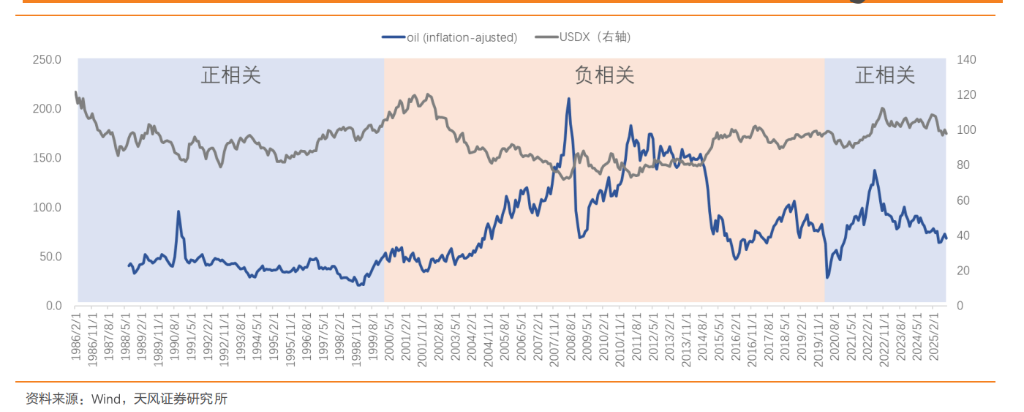 回归显示,1988-2000年,油价和美元指数正相关;2000-2020年,变成负相关;2021年及之后,再度变成正相关。