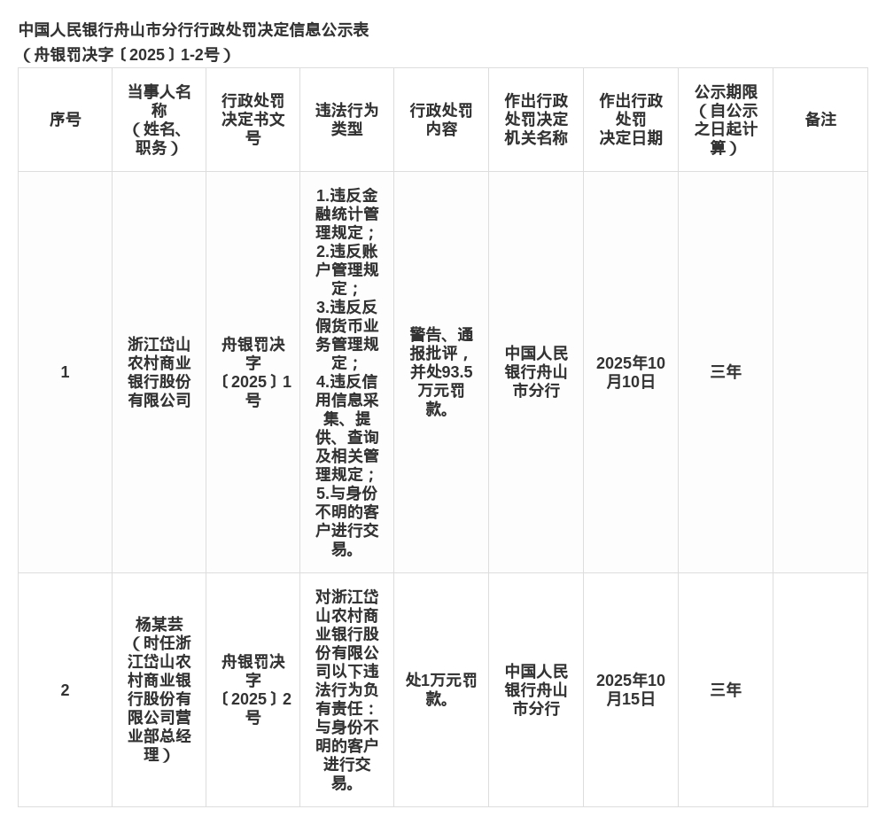 此外,时任浙江岱山农村商业银行股份有限公司营业部总经理杨某芸,因对与身份不明的客户进行交易的违法行为负有责任,被处以1万元罚款。