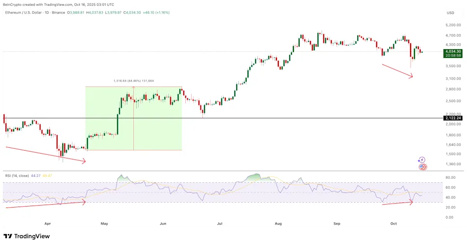 以太坊价格近日显示出一个数个月前才出现过的罕见技术信号,就在它上涨超过80%之前。该代币于10月16日晚上的交易接近4,050美元,过去一周内下跌接近8%,30天内几乎下跌10%,显示出明显的下行趋势。但新的链上数据和一个熟悉的动量模式表明这个下降可能正在消失。