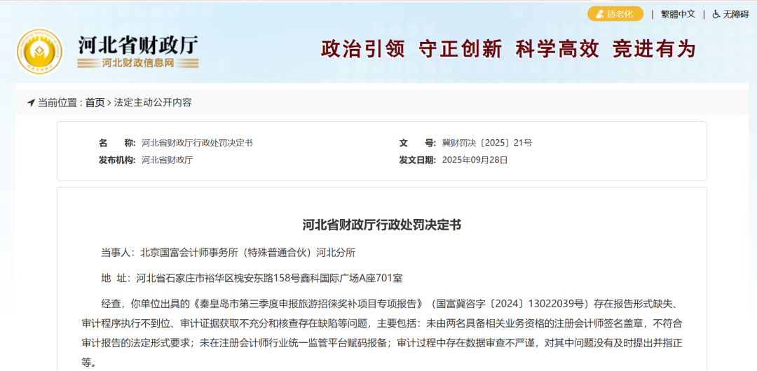 经查,北京国富会计师事务所(特殊普通合伙)河北分所出具的《秦皇岛市第三季度申报旅游招徕奖补项目专项报告》(国富冀咨字〔2024〕13022039号)存在报告形式缺失、审计程序执行不到位、审计证据获取不充分和核查存在缺陷等问题,主要包括:未由两名具备相关业务资格的注册会计师签名盖章,不符合审计报告的法定形式要求;未在注册会计师行业统一监管平台赋码报备;审计过程中存在数据审查不严谨,对其中问题没有及时提出并指正等。