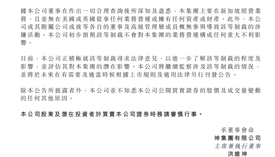坤集团强调核心业务集中于新加坡,既未在美英开展业务,也未在两国持有资产,且公司及下属机构、管理层均未参与涉嫌制裁的相关活动,据此初步判断制裁不会对营运造成重大不利影响。