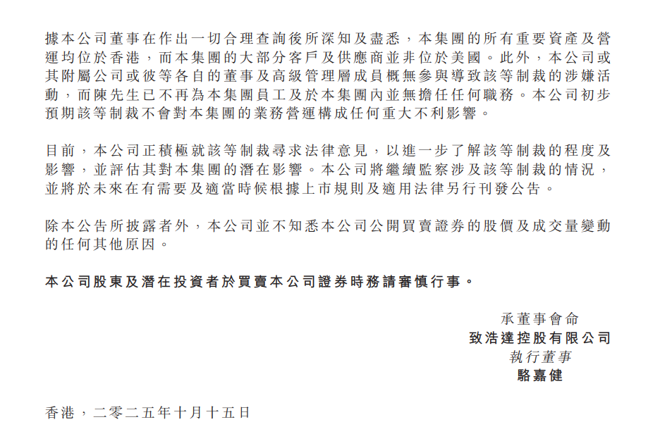 和坤集团措辞一致,致浩达同样强调,公司、附属公司及相关管理层均未参与涉制裁的涉嫌活动。