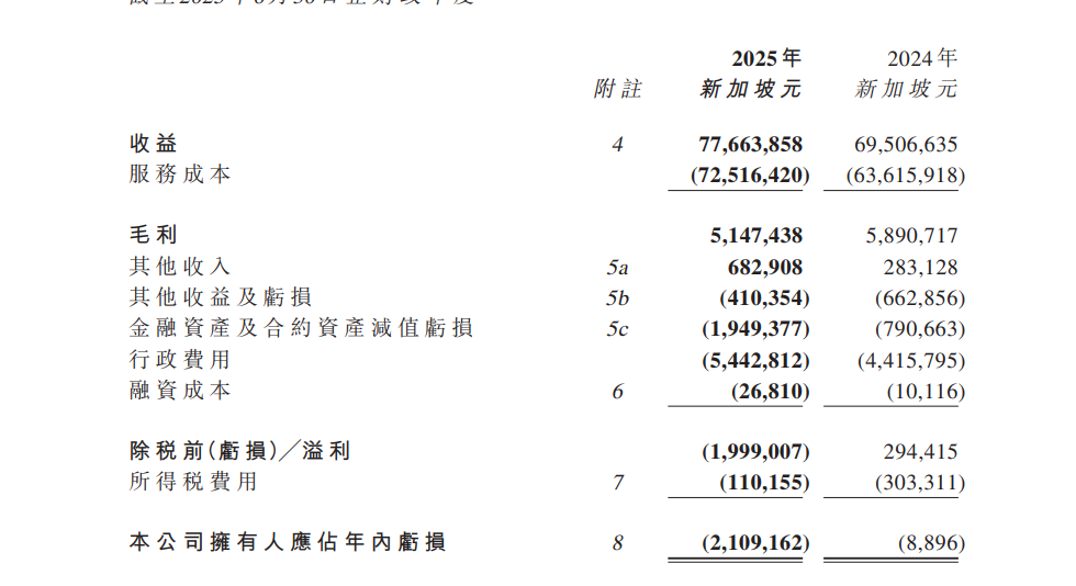 但光鲜数据背后,藏着致命隐患。同期毛利不仅没涨,反而跌了12.6%,从590万新加坡元跌至510万新加坡元,毛利率也从8.5%滑落至6.6%。深究原因,是“服务成本飙升直接挤压了利润空间。”