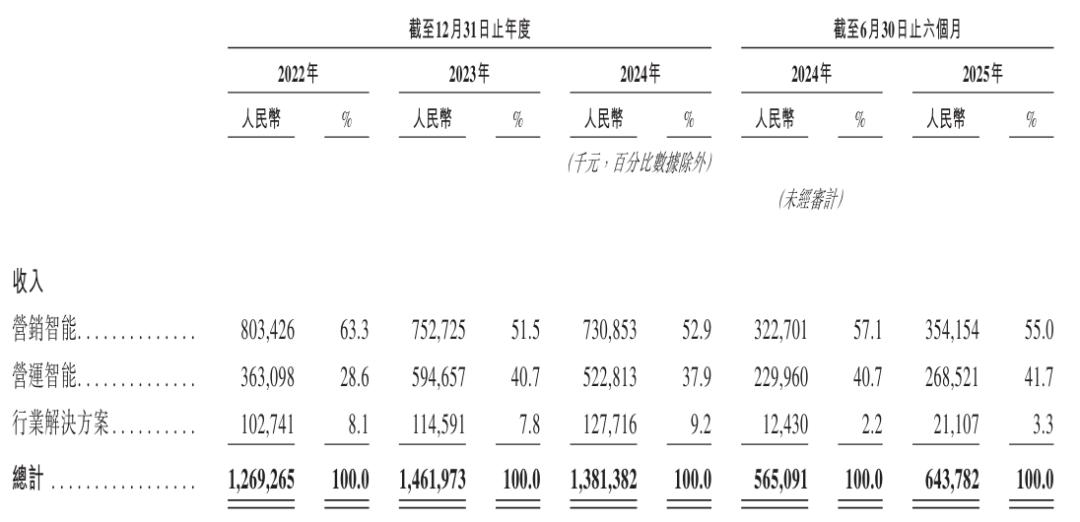 明略科技的收入分别为营销智能、营运智能和行业解决方案三部分,其中,明略科技2025年上半年来自营销智能收入为3.54亿元,占营收的比例为55%;来自营运智能收入为2.68亿元,占比为41.7%。