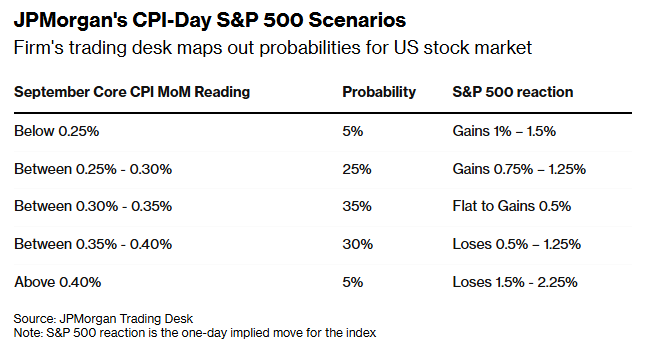 摩根大通的交易部门认为,即使经济学家预计通胀数据将高于预期,标普500指数在数据公布后仍有约65%的几率上涨。该行分析师指出,美国9月CPI公布当天美国股市的波动性可能“低于往常”,因为投资者预期美联储将在10月29日再次降息,这种信心可能抵消与通胀相关的担忧。