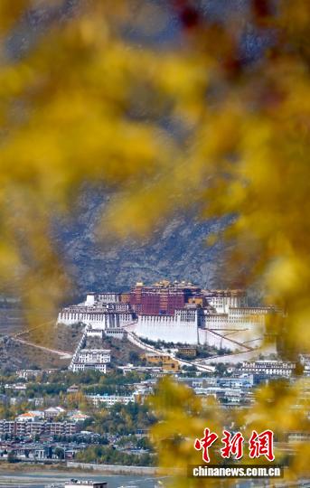 10月20日,西藏拉萨深秋如画。图为拉萨天堂草原自然风景区的黄叶与布达拉宫相映成趣。中新社记者 李林 摄编辑:呼乐乐