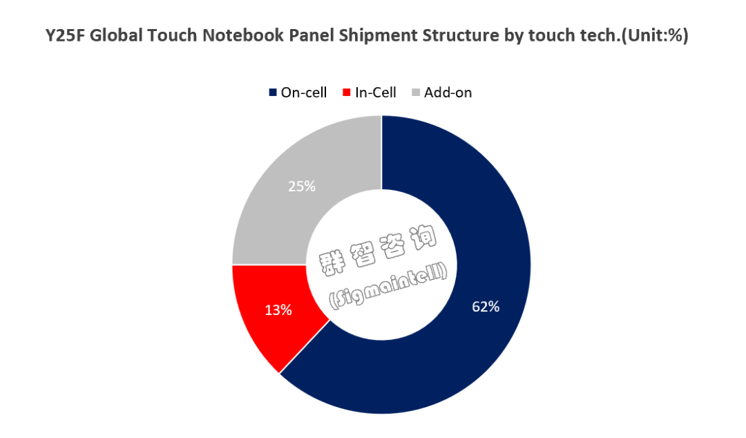 再从Touch领域的发展态势来看,群智咨询(Sigmaintell)数据显示,2025年面板厂商的Touch笔电模组出货量预计将达到约2540万台,在笔电面板市场的出货占比为11%。在Touch笔电模组的细分类型中,On-cell 类型占据主导地位,其市场份额最高,约为 62%;以外挂式Touch为主的OGS类型,占比约为25%;而 In-cell 类型的市场份额相对较小。