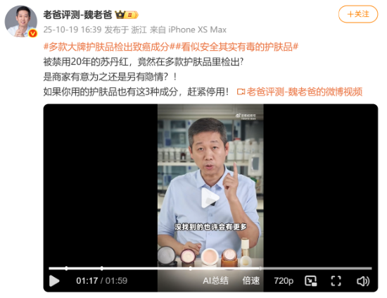 随后,老爸评测对市面多款使用同款原料的护肤品进行公证买样检测,结果均检出苏丹红。尽管视频中对品牌进行模糊处理,网友仍迅速锁定科颜氏、花西子、farmacy、且初等品牌。