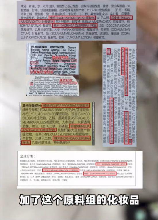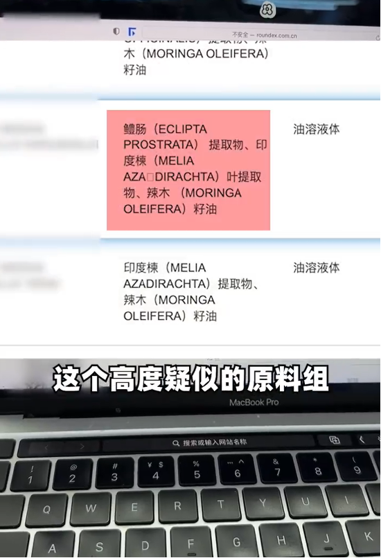 通过溯源分析,老爸评测团队将目标锁定在一家原料商所提供的红色复合植物原料组,该原料组包含鳢肠提取物、印度楝叶提取物和辣木籽油。