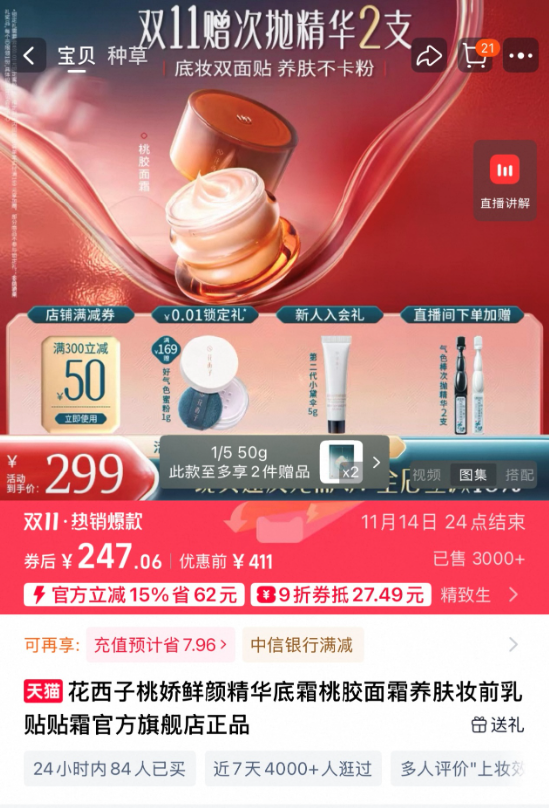 此外,从测评视频中展示的成分表看到,其中一款含有苏丹红成分的产品为花西子桃娇鲜颜精华底霜。截至发稿,该产品在电商网站上仍正常售卖。
