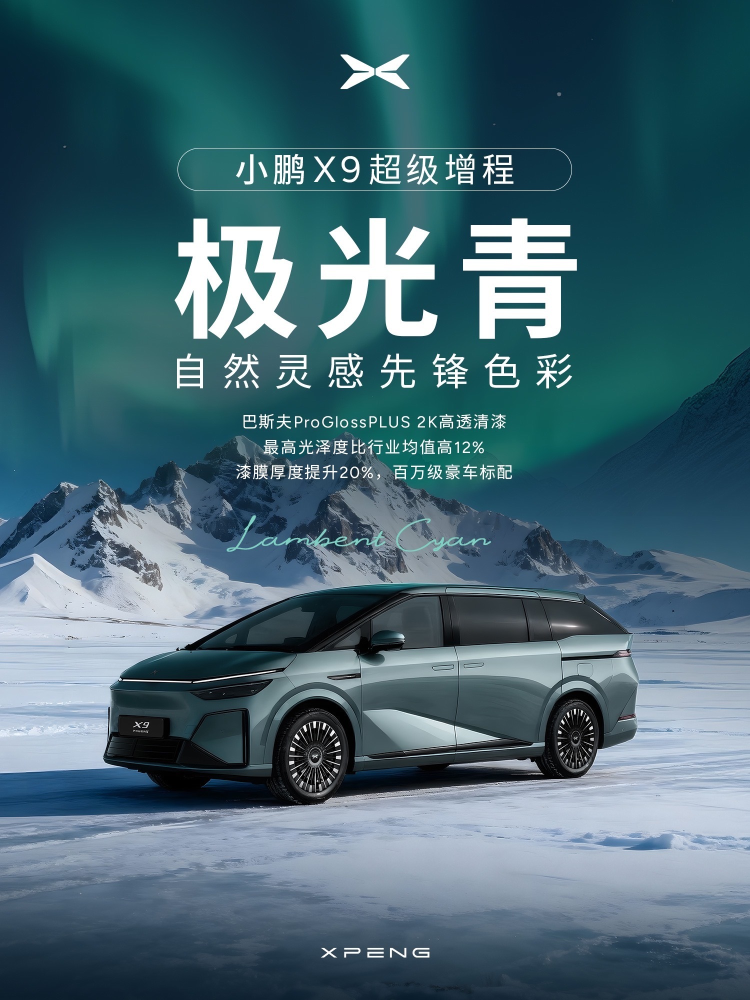 昨天下午,小鹏 X9 增程版官宣了全新的配色“极光青”,源于北极圈漫长极夜中转瞬即逝的一抹青色极光。