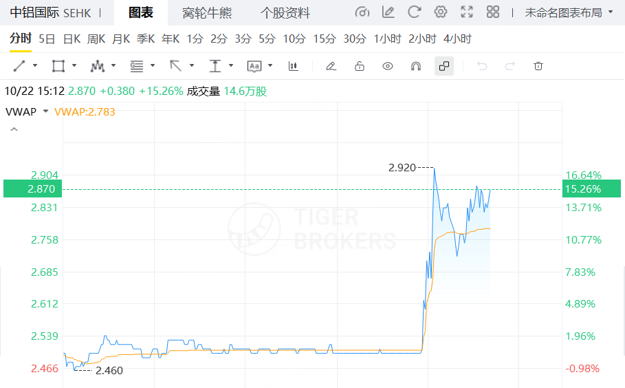 10月22日,中铝国际AH股午后齐升,截至发稿,A股封涨停,H股涨超15%。