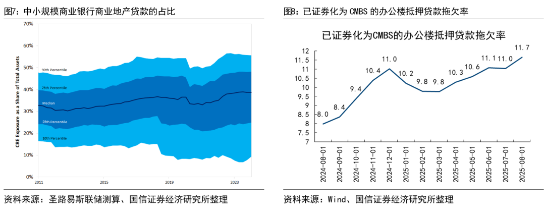 其二,商业地产基金的信用质量持续恶化。本轮风险的直接暴露点来自投资不良商业地产的基金,这类基金大量投资于流动性差、回报疲弱的写字楼与零售物业项目,并通过结构化融资与衍生品再包装,将底层不良资产转化为 CMBS 或私募信贷产品,再分层售予投资者。数据显示,8月已证券化为CMBS的办公楼抵押贷款拖欠率高达11.7%,创历史新高。这使得风险在区域银行体系内累积发酵。