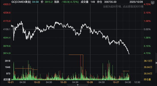 截至发稿,国际黄金价格进一步下跌。COMEX黄金已跌至3920美元/盎司下方。