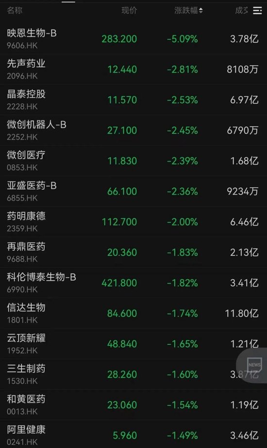 医药股今日走弱。映恩生物跌超5%,先声药业、晶泰控股、药明康德等跌幅在2%以上。