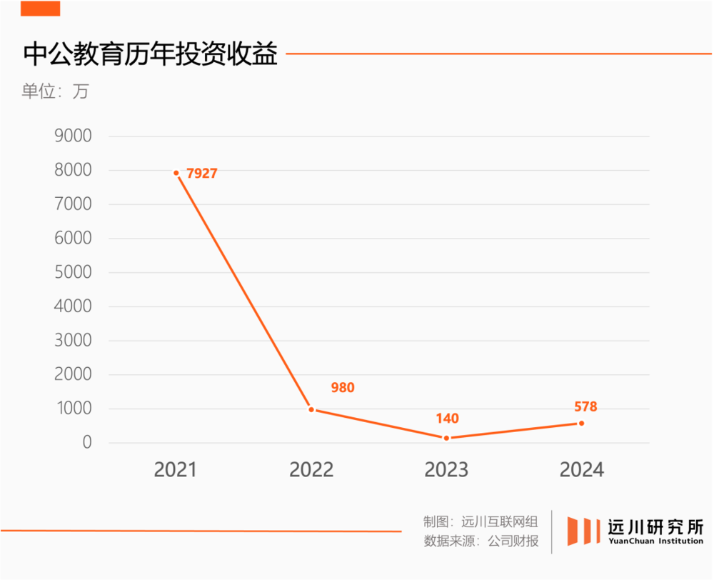 2021年,中公教育投资收益7927万,但在近24亿的亏损面前杯水车薪。此后几年理财收益还在光速萎缩,去年中公教育艰难盈利,投资对利润总额的贡献只有两个点。