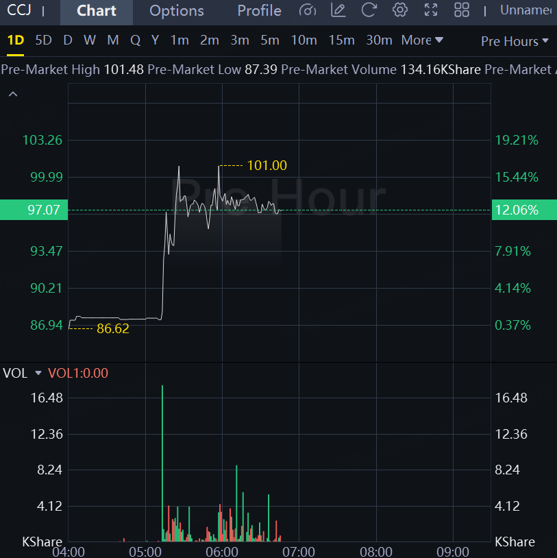 U.S.-listed shares of Canadian uranium supplier Cameco rise 12% to $97.07 premarket.