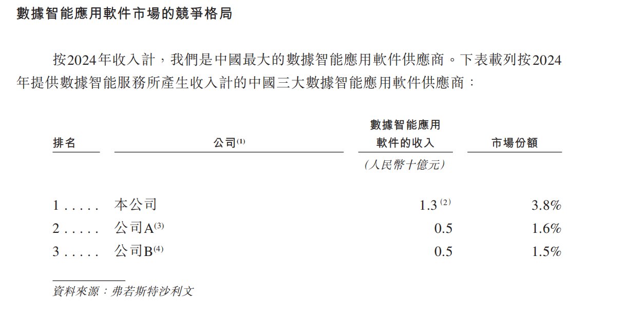 值得注意的是,明略科技约203.57亿港元的IPO估值对应其2024年13.81亿港元的收入的PS估值高达14.74倍,虽然与腾讯的强绑定能带来一定的估值溢价,若明略科技的营收若不能快速成长,该高估值或难以维持。作为对比,若以弗若斯特沙利文的对比口径来看,中国第二大的数据智能应用软件提供商已在香港上市,而该公司2024年的整体收入已超50亿元,但当前市值对应的PS估值不足6倍。