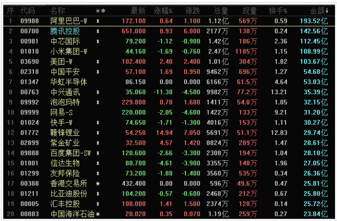 盘面上,大型科技股走势明显分化,铜业股、黄金股领衔有色金属股上涨,锂电池板块全天表现强势,赣锋锂业业绩超预期大涨近15%领衔;煤炭股、港口及海运股、光伏股、核电股、家电股、建材水泥股多数活跃。内房股集体弱势,苹果概念股、体育用品股、啤酒股、餐饮股等消费类股多数低迷。