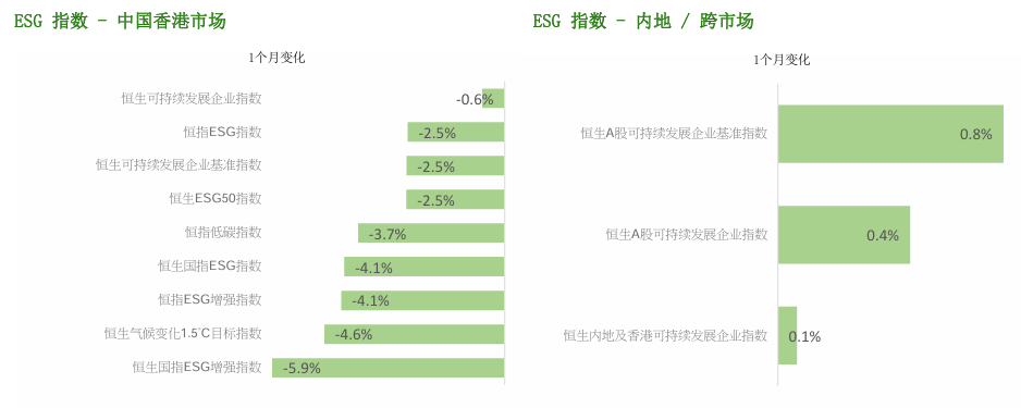在ESG指数系列中,恒生可持续发展企业指数在中国香港市场表现较佳(-0.6%);而恒生A股可持续发展企业基准指数则在内地/跨市场表现较佳(+0.8%)。