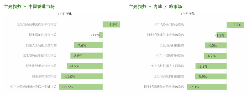 在主题指数系列内,恒生港股通中国内地银行指数在中国香港市场表现较佳(+4.5%);而恒生A股电网设备指数则在内地/跨市场表现较佳(+3.2%)。