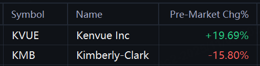 Shares of Kenvue were up 19.7% in premarket trading, while Kimberly-Clark's shares were down 15.8%. Kenvue's shareholders will get $21.01 per share in cash and stock, which implies a premium of 46.2% to the stock's last closing price.
