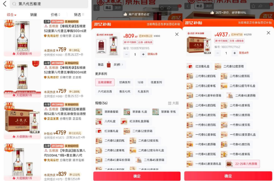 以百亿补贴为例,第八代五粮液单瓶价格普遍在750-830元之间;另外,在京东超市白酒自营区,第八代五粮液的散瓶价格也降至810元,原箱单瓶价格约822元,均低于线下批发价格。