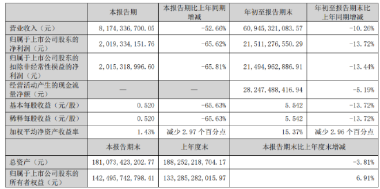 其中第三季度,五粮液的营业收入和净利润分别为81.74亿元、20.19亿元,同比分别减少52.66%、65.62%,双双“腰斩”。横向对比,同为浓香头部的泸州老窖三季度实现营业收入66.74亿元,同比下降9.80%;归属于上市公司股东的净利润30.99亿元,同比下降13.07%,数据跌幅均小于五粮液。