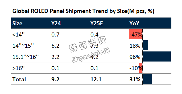 另一方面,针对中高端游戏本市场,16英寸2.5K 165Hz和240Hz ROLED成本优化,也获得了以联想和华硕为代表的游戏本领军品牌的积极导入。如下表所示,在“主流化+电竞化”双线产品策略的拉动下,2025年ROLED 14英寸和16英寸的出货能力获得了显著提升。