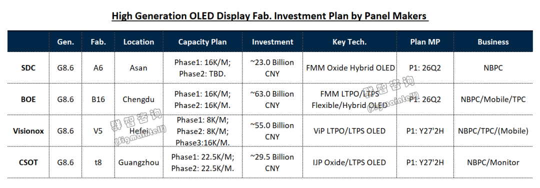 由于OLED技术在手机应用的普及化,以及Apple明确将IT产品线逐渐切换到OLED技术的战略布局,近年来全球OLED面板领军厂商加速布局IT市场。如下所示,未来两年内,全球显示面板产业将迎来四条8.6代OLED产线的量产,分别为三星显示(SDC) A6、京东方(BOE) B16、维信诺(Visionox) V5与华星光电(CSOT)t8。尤其值得关注的是A6和B16,都将于2026年Q2迎来笔电项目的量产,这标志着全球笔电面板行业的技术竞争格局将正式迈入高世代线竞争的新时代