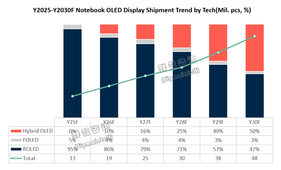 2026年,以FOLED+Hybrid OLED为并行技术策略,主要在高端OLED笔电市场逐渐渗透,其导入的品牌客群将集中在高端市场具影响力的特定品牌群。