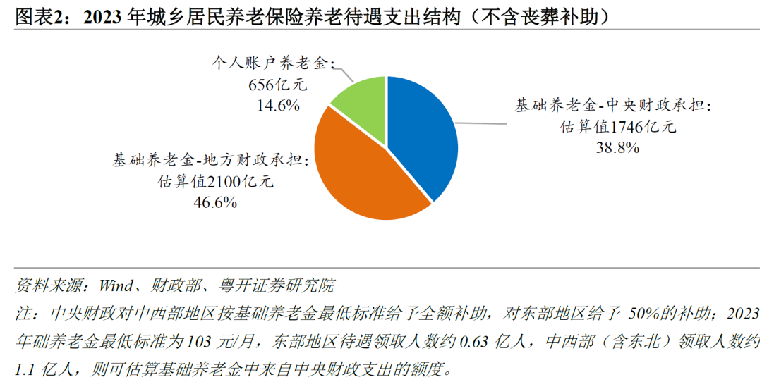 2014年正式推行的城乡居民基本养老保险吸取了历史经验,在要求个人少量缴费的同时引入了财政出资的基础养老金,其养老待遇由三部分组成:一是中央财政出资的基础养老金,2024年为每人123元/月(东部地区需由地方财政承担其中的50%);二是地方财政在中央标准基础上加发的基础养老金;三是个人缴费累积形成的个人账户养老金。