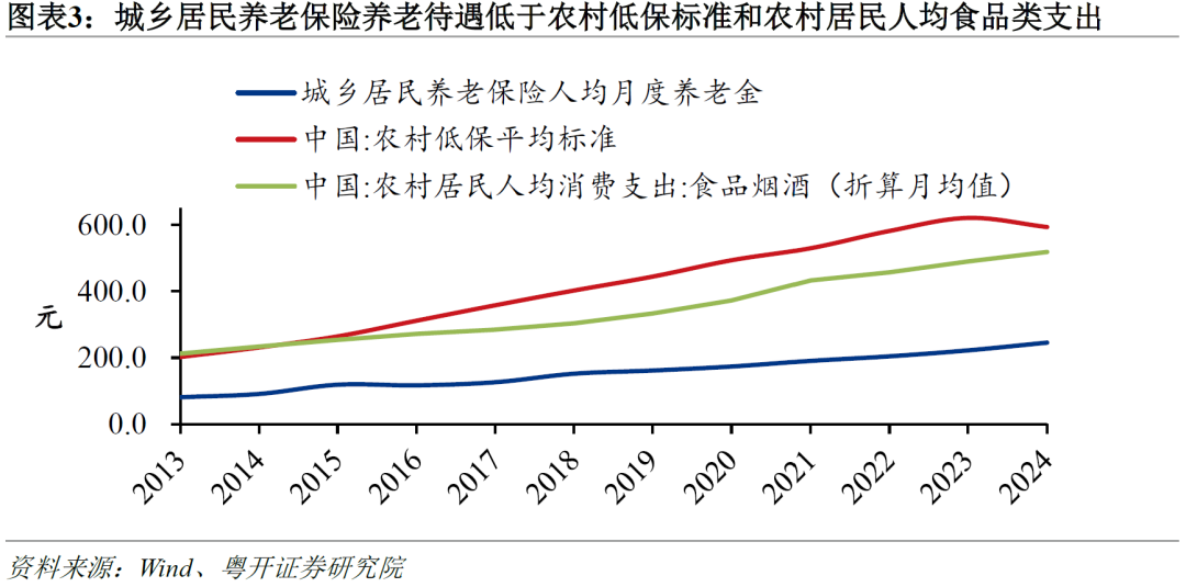 一是养老金的绝对水平低于食品类支出和低保水平,难以满足基本生活需要。2024年,参保城乡居民保险的老年人养老金平均为246元/月(2023年为223元/月),而2024年全国农村月均低保平均标准为594元、农村居民月度人均食品类消费支出为519元。