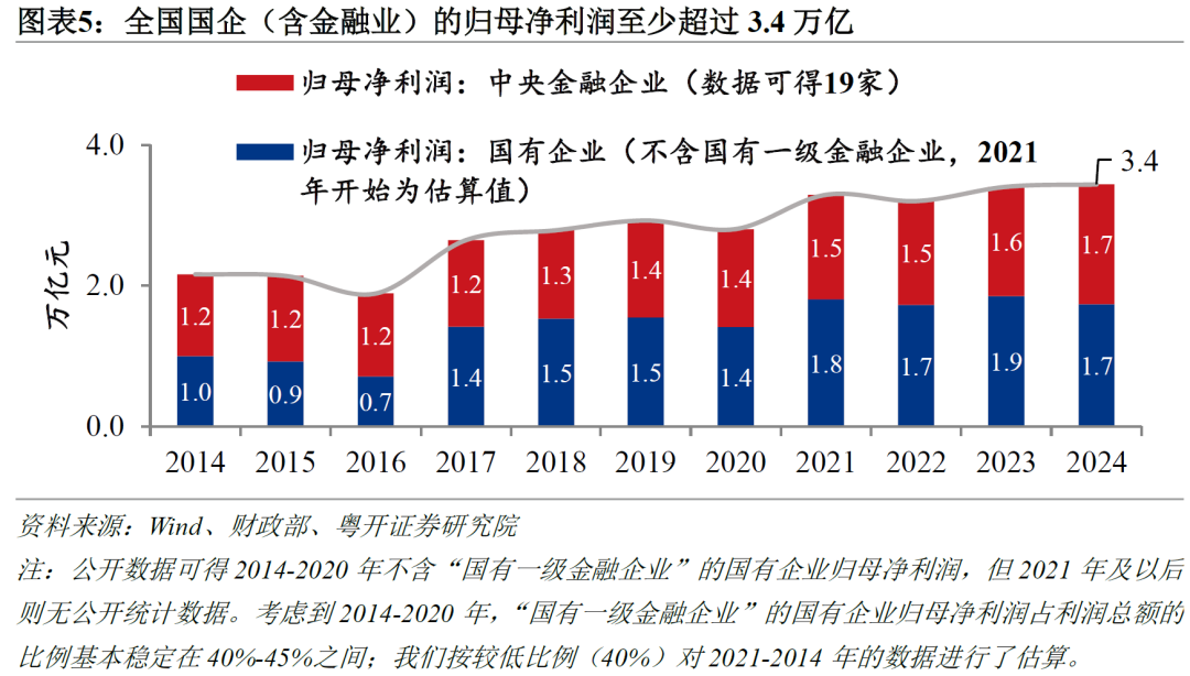 归母净利润方面,估算得到:2024年,不含“国有一级金融企业”的国有企业归母净利润已达1.7万亿,数据可得的19家金融央企的归母净利润也有1.7万亿。所以,包含金融业在内的国企年度归母净利润至少已超3.4万亿。