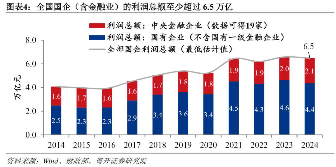 目前,国有企业运营状况良好,盈利稳步增长。据估算,包含金融业在内的国企年度利润总额至少已超6.5万亿元、归母净利润至少超过3.4万亿,具备支持城乡居民养老待遇提升的能力。根据财政部数据,2024年,不含“国有一级金融企业”的国有企业利润总额为4.4万亿。公开文件中没有关于“国有一级金融企业”的明确解释,但其所涵盖的最小范围应该是27家金融央企。通过尽可能全面地统计金融央企的盈利数据,我们就可以得到所有国企盈利的最低估计值。根据上市金融央企和发债金融央企的年报,2024年,数据可得的19家金融央企的利润总额达到2.1万亿。所以,到2024年,包含金融业在内的国企年度利润总额至少已超6.5万亿元(4.4+2.1万亿)。
