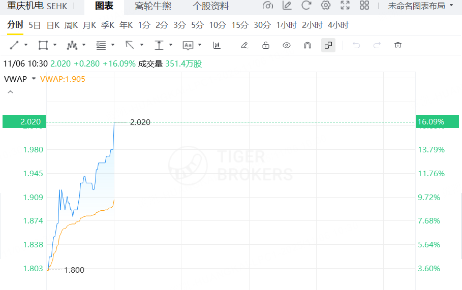 11月6日,重庆机电盘中涨超16%,成交额超1亿港元。