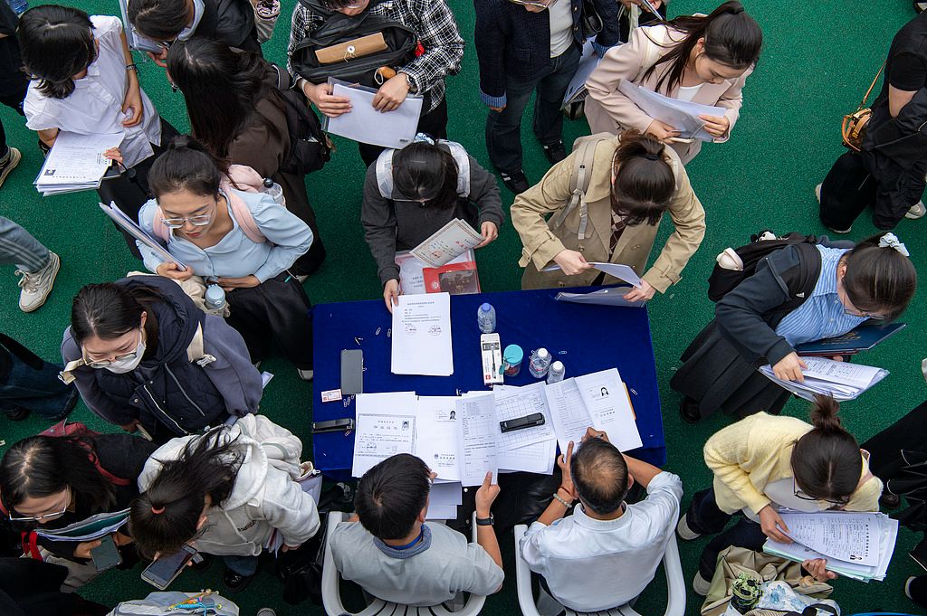 2025年11月8日,位于浙江省金华市的浙江师范大学校园里,大学生在师范类专场招聘会上排队应聘就业岗位。